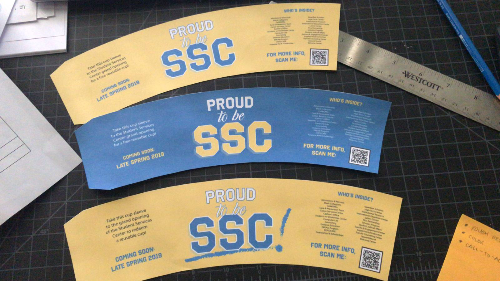 We designed a coffee cup sleeve that advertises the Student Services Center and promotes its resources, with incentivization and environmental sustainability in mind.